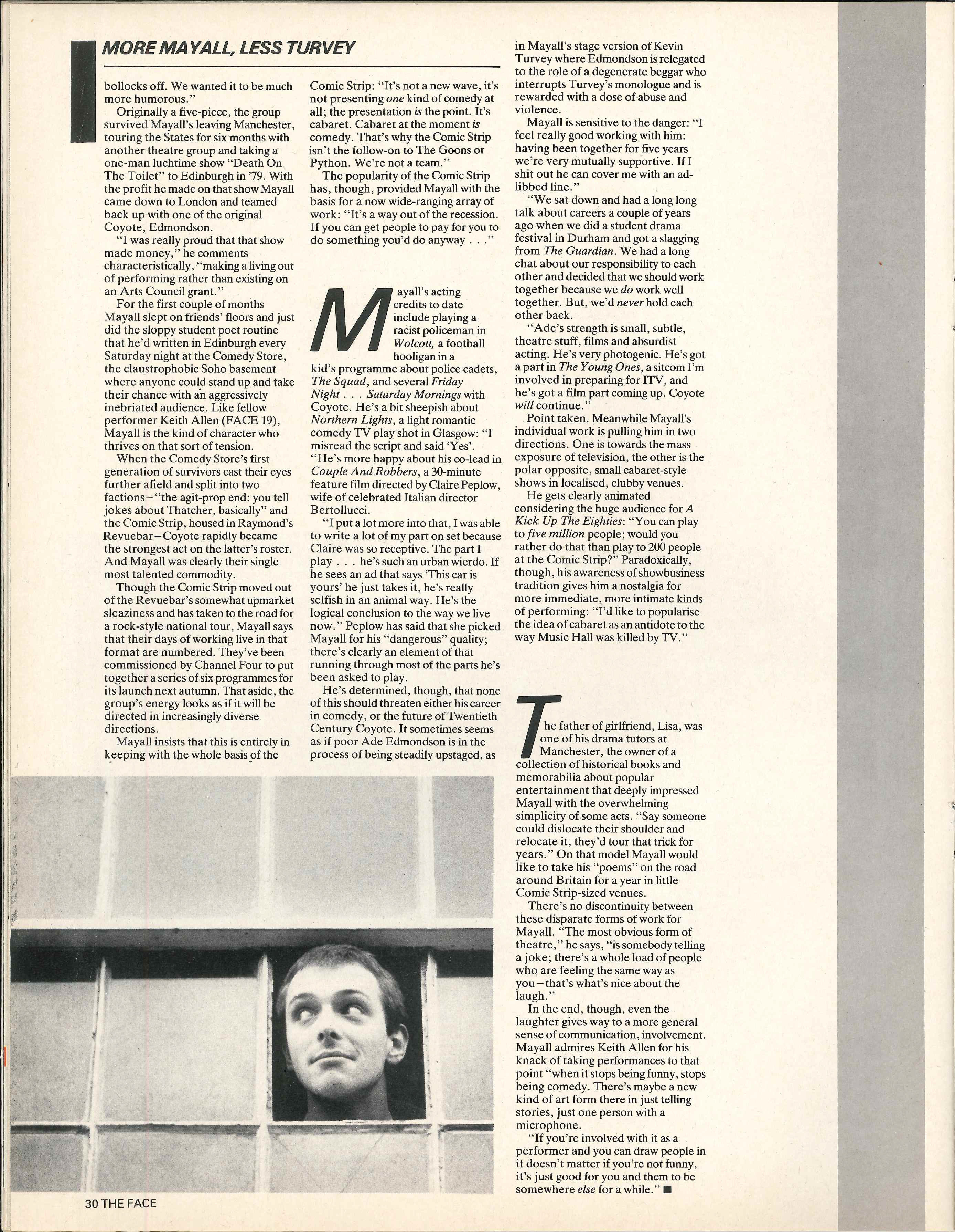For the first couple of months Mayall slept on friends floors and just did the sloppy student poet routine that he’d written in Edinburgh every Saturday night at the Comedy Store, the claustrophobic Soho basement where anyone could stand up and take their chance with an aggressively inebriated audience. Like fellow performer Keith Allen (FACE 19), Mayall is the kind of character who thrives on that sort of tension.