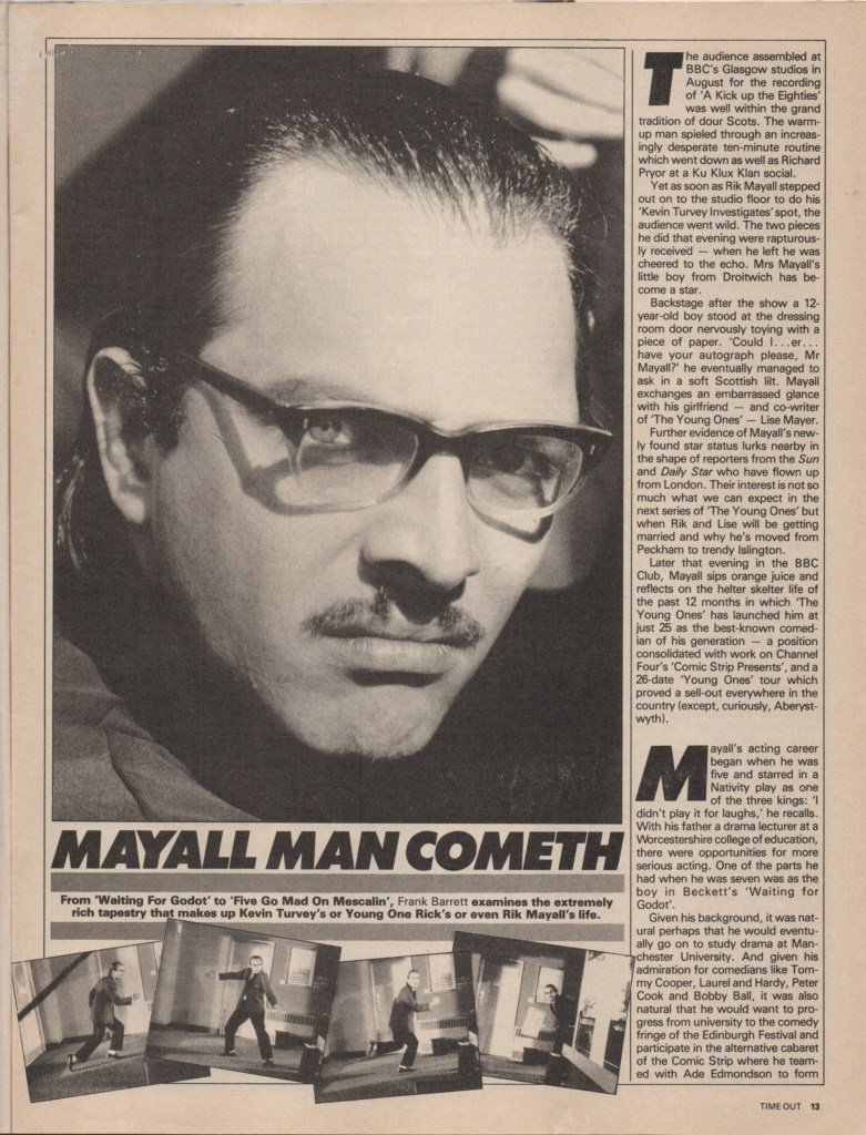 Mayall has found the last year of whirlwind success occasionally disconcerting, especially the demands of a public who expect to see him as Kevin Turvey or Young Ones’ Rick: ‘People expect you to be something else – I’m having trouble with my off-stage persona.’ He gratefully admits that he is less often recognised in the street than others in the series because of all the faces he pull on camera.