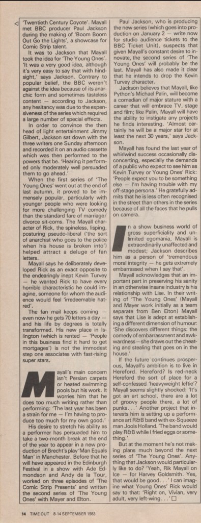 Later that evening in the BBC Club, Mayall sips orange juice and reflects on the helter skelter life of the last 12 months in which ‘The Young Ones’ has launched him at just 25 as the best-known comedian of his generation – a position consolidated with work on Channel Four’s ‘Comic Strip Presents’, and a 26-date ‘Young Ones’ tour which proved a sell-out everywhere in the country (except, curiously, Aberystwyth).