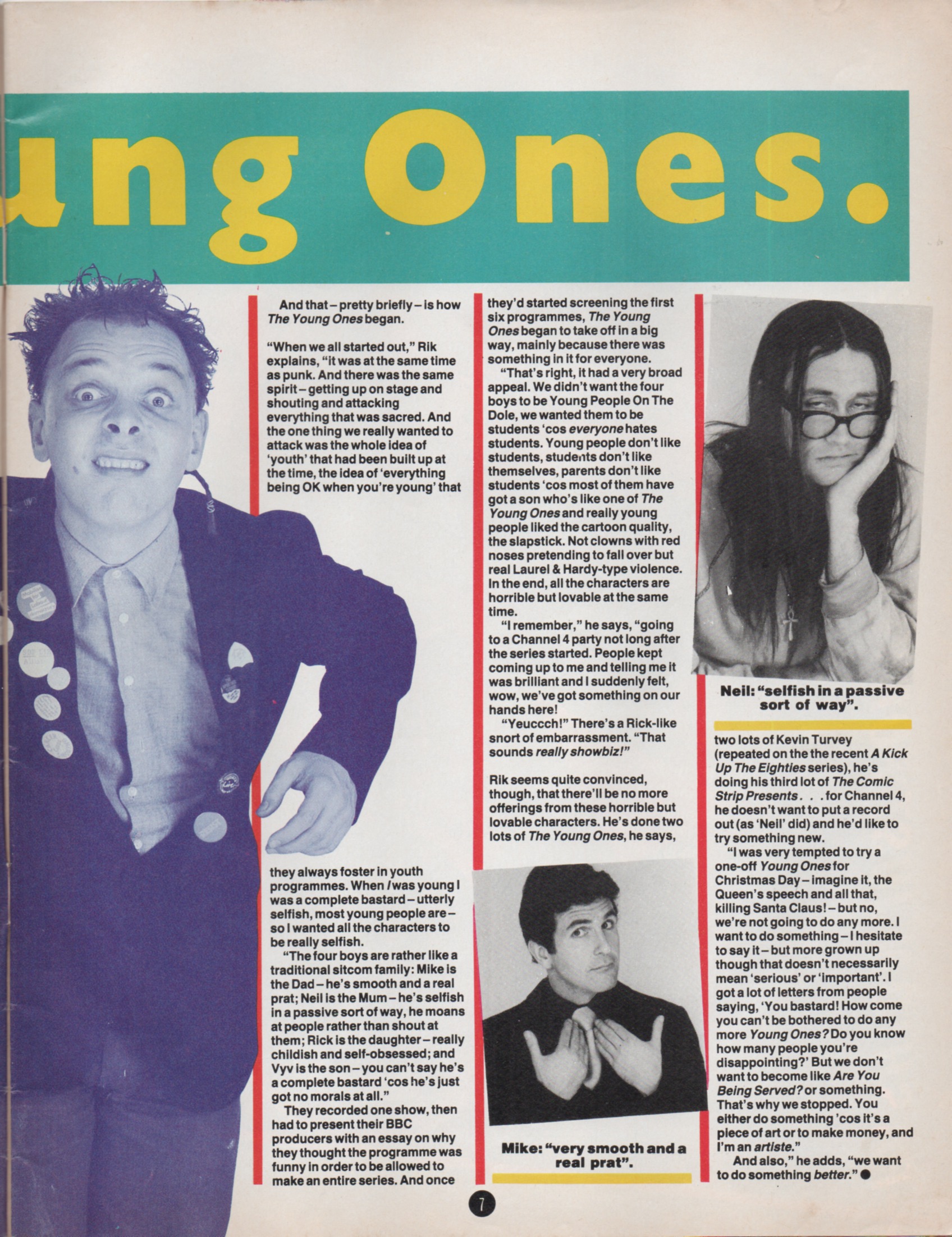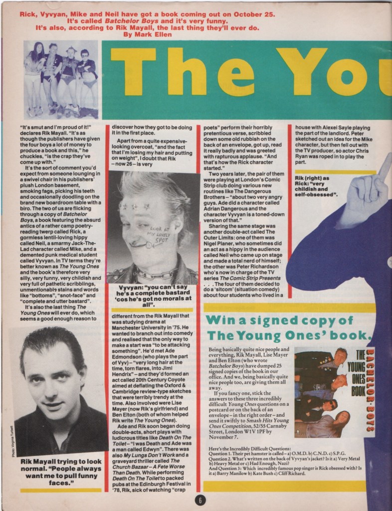 It’s the sort of comment you’d expect from someone lounging in a swivel chair in his publishers’ plush London basement, smoking fags, picking his teeth and occasionally doodling on the brand new boardroom table with a biro. The two of us are flicking through a copy of Bachelor Boys, a book featuring the absurd antics of a rather camp poetry reading twerp called Rick, a gormless lentil-loving hippy called Neil, a smarmy Jack-The-Lad character called Mike, and a demented punk medical student called Vyvyan. In TV terms they’re better known as The Young Ones and the book’s therefore very silly, very funny, very childish and very full of pathetic scribblings, unmentionable stains and words like “bottoms”, “snot-face” and “complete and utter bastard”.