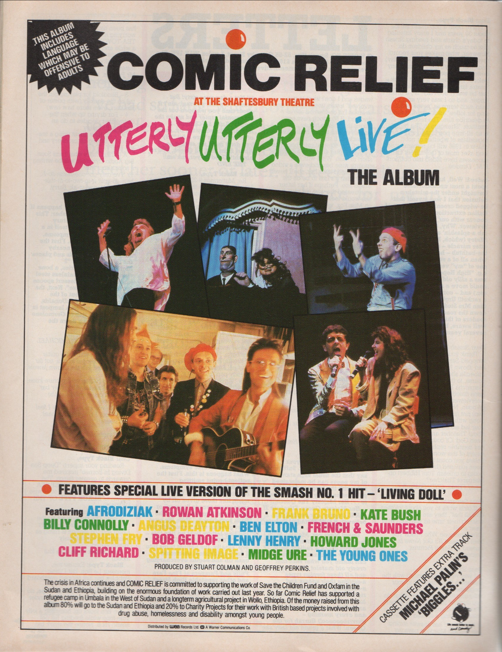 The very first Comic Relief fund-raising performance ‘Comic Relief Utterly Utterly Live’ took place on 4th, 5th & 6th April 1986 at the Shaftesbury Theatre in London, and pre-dates Red Nose Day by two years. The cream of British comedy performed sketches and songs with some surprising musical guests.