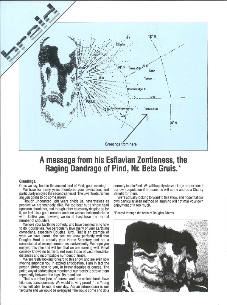 First to arrive was Rowan. Then Graham Chapman. Then Stephen Fry and Hugh Laurie together. Then Ben Elton and Pamela Stephenson together. Angus Deayton arrived and once again, no one asked for his autograph, so I did as I felt a bit sorry for him! There was Billy Connolly, Christopher Ryan. Terry Gilliam (with a plank of wood for the Python sketch – cut from the TV recording). Michael Palin arrived but wouldn’t sign any autographs. Lenny Henry arrived running in at full speed and he ran past everyone ignoring us all.