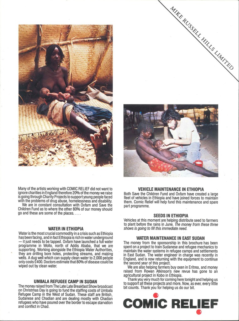 The Secret Policeman’s Ball, in aid of Amnesty International had previously seen the Monty Python team join forces with Beyond the Fringe in the 70’s and early 80’s and paved the way for an evening of entertainment for charity fundraising, combining comedians, music artist and well know celebrities. Bob Geldof was inspired and on 13th July 1985, Live Aid took place to raise funds for the famine in Ethiopia.
