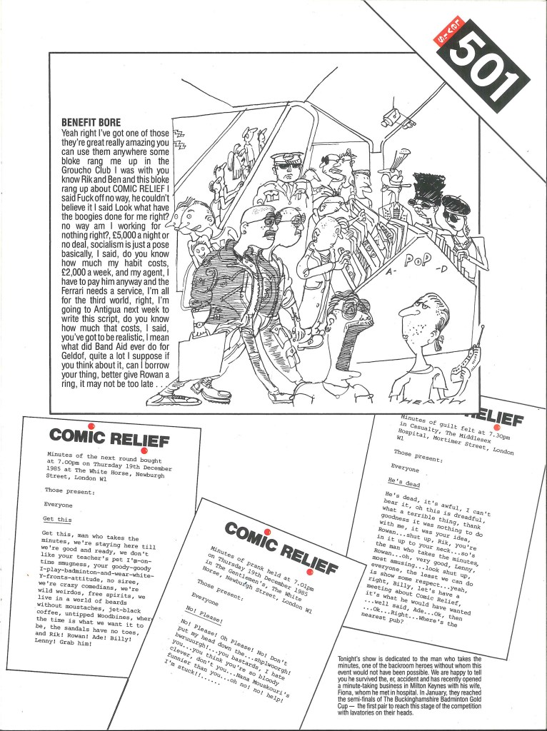 First came the charity single in March 1986, which saw Cliff Richard team up with The Young Ones to record Living Doll. Here is Rik telling everyone about it on the Wogan show. This was probably where I and many of my school friends first heard about Comic Relief. Plus seeing features in magazines like Smash Hits and Lookin. The charity single was a big hit with us kids, we all loved The Young Ones and thought we’d never see them again after they fell off that cliff! So it was great to have them back again when this single was released.