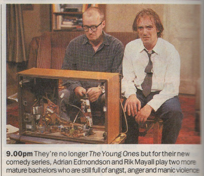 You wouldn’t expect a comic collaboration between Rik Mayall and Ade Edmondson to yield jokes that appeal to old men fed on Victorian editions of Punch. And true to form, after the excesses of The Young Ones and Fithy Rich and Catflap the pair penned a sitcom with the working title of Your Bottom. For weeks they indulged themselves with , ‘Hey, I saw Your Bottom on television last night’ and ‘Have you seen Ade in Your Bottom? ‘But we settled on plain Bottom,’ says Mayall. ‘We liked the shape of the word.’