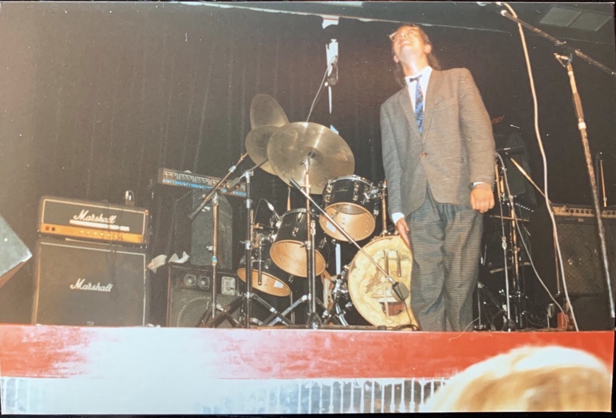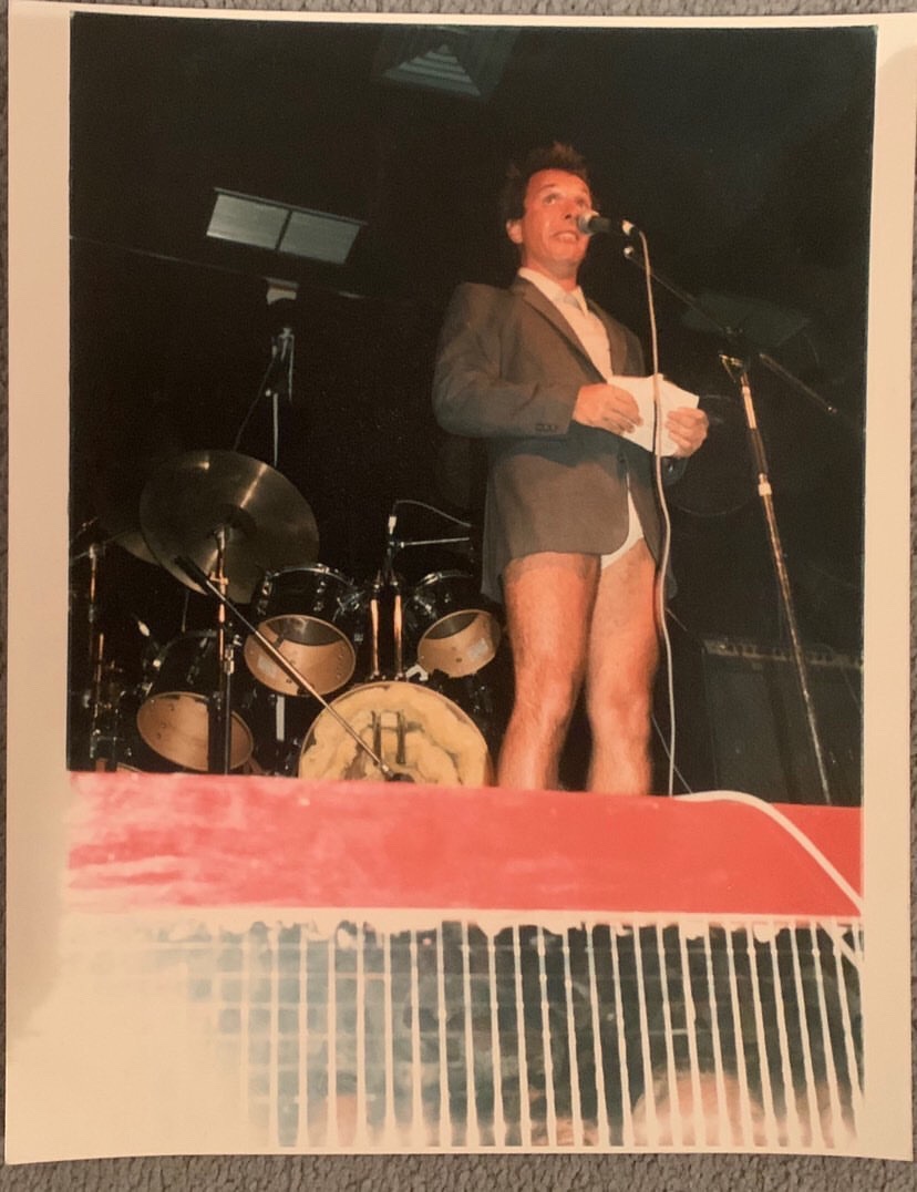 In the early 80’s Chris had gone on holiday to Ibiza with some friends. He’d seen Rik on TV as Kevin Turvey and was also aware that there was a buzz about this ‘Alternative Comedy’ scene breaking out. He saw the poster and thought, let’s go! He recalls them not coming on stage until about 2am, but thankfully was fit and sober, and glad he stayed. Luckily for us he also had his camera with him, was sat right at the front on the floor with, can you believe only about 20 or so other audience members! Ben performed first, then ‘Kevin’ who stood behind the curtain talking as Kevin Turvey, trying to convince the audience that he was dressed as a giraffe, before then coming out in a rabbit costume, later Rik then stripped off and performed as ‘Rick’.