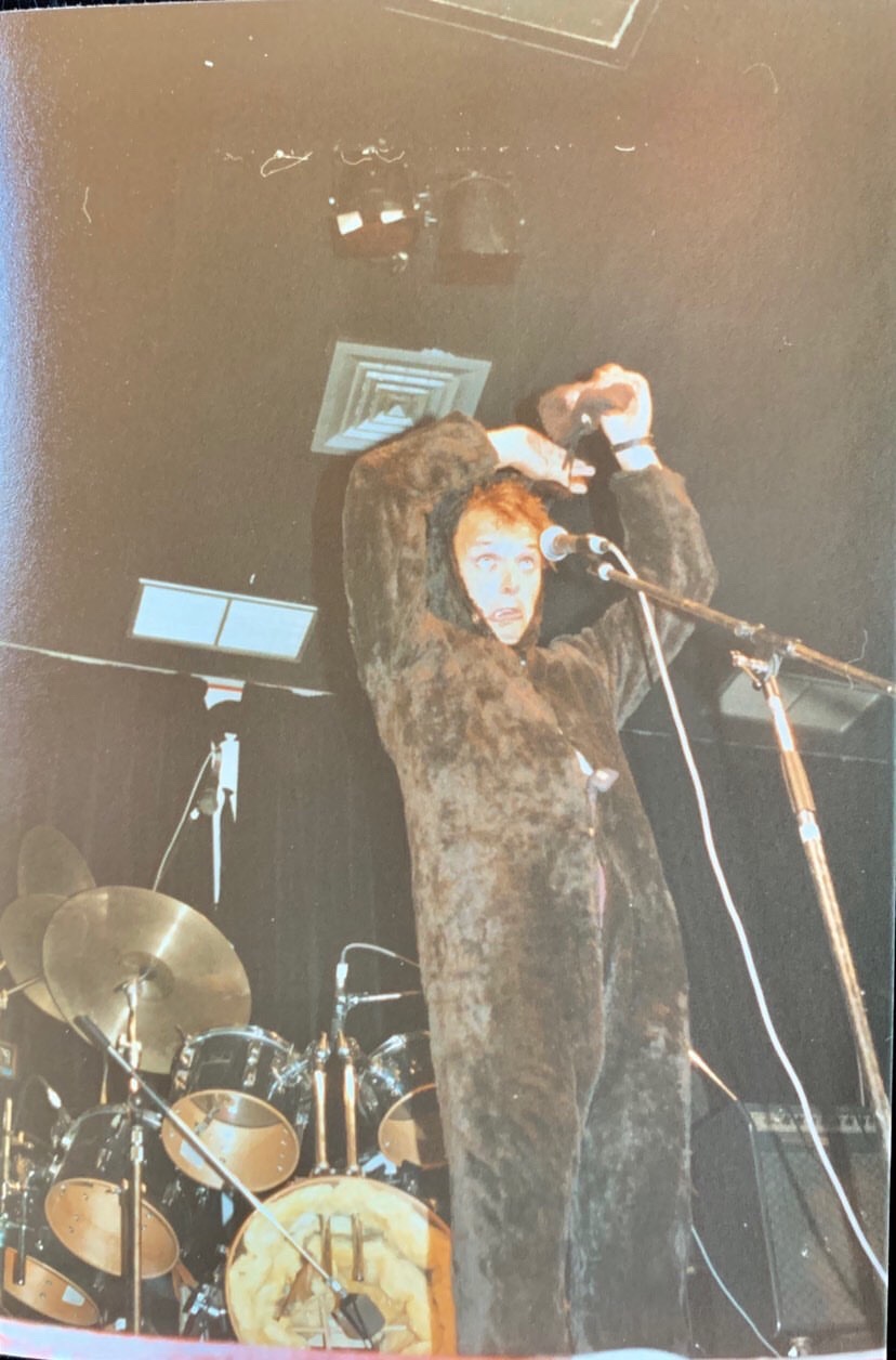 Then the main event. I can remember Rik as Kevin pretending not to come on as he was scared. Maybe this was the giraffe bit and then he came on. I’d forgotten he was dressed in a rabbit suit. He did a set as Kevin, before he unzipped and had dressed as Rik. I can remember him snorting at us and sticking to fingers up at us.
