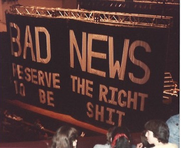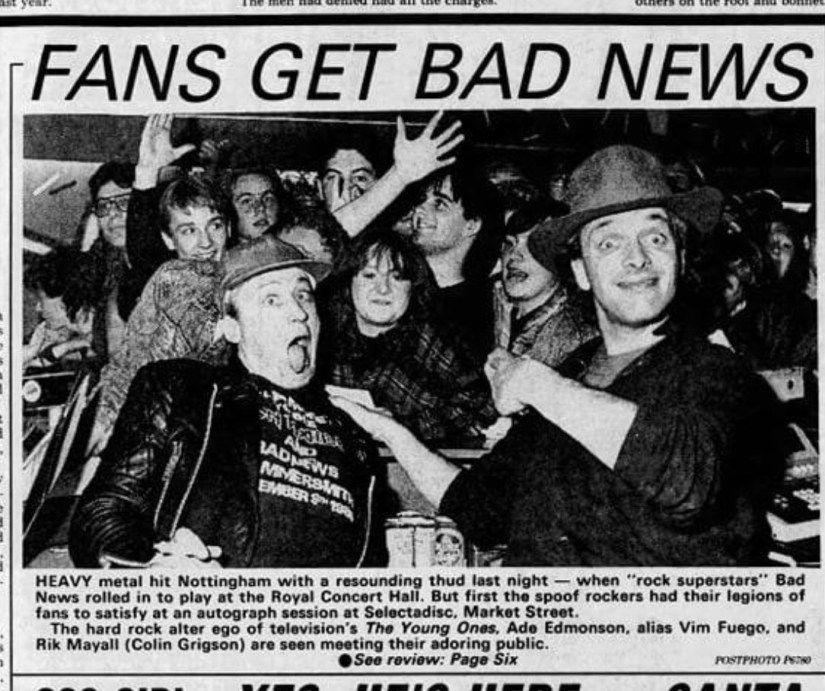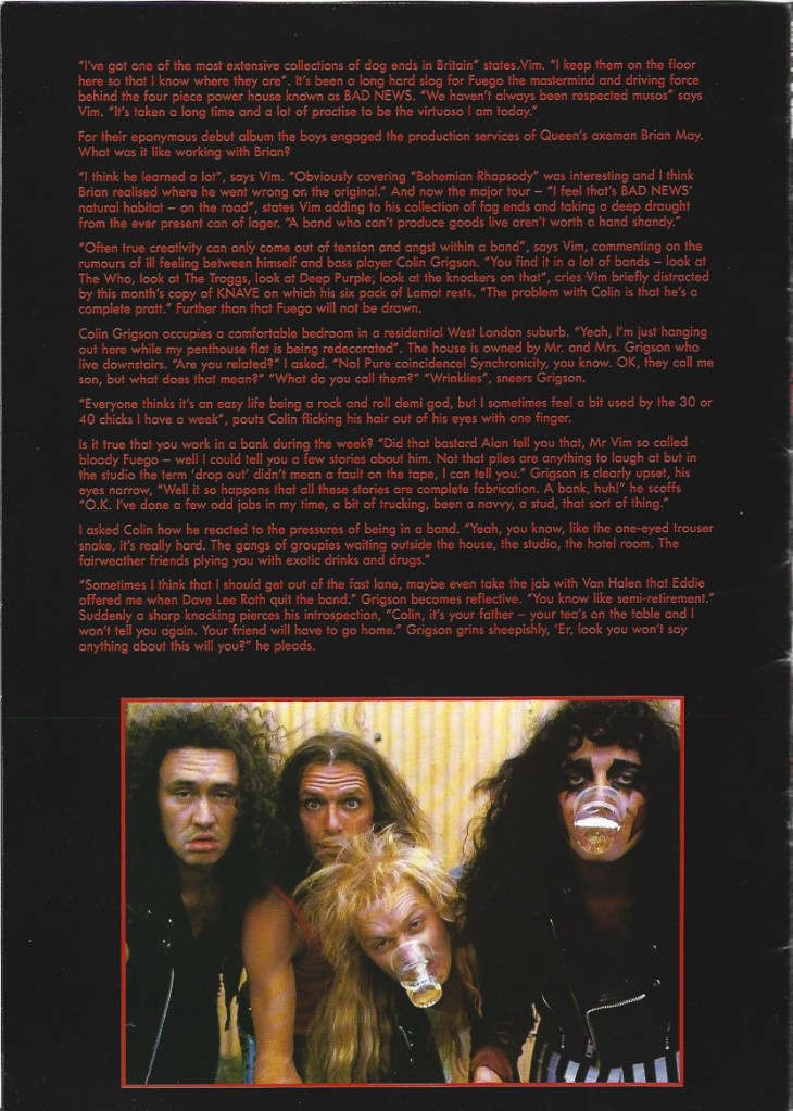 Yes I saw Bad News at the Donnington Monsters of Rock Festival and they were atrocious. Hahaha no seriously though a lot of fun and they had the crowd roaring with laughter. Like most people I had watched the Comic Strip program countless times before and since. One point. You give a listing of the gigs they played in 1987 and it says they played at the Cornwall Coliseum 31st October. I’m not sure about that. It was my local venue and I don’t recall them being there. Also I have a complete listing of all the concerts at the venue from 1980 onward and they’re not on the list. Perhaps they cancelled the gig? Anyway great site you have here. Love Rik.