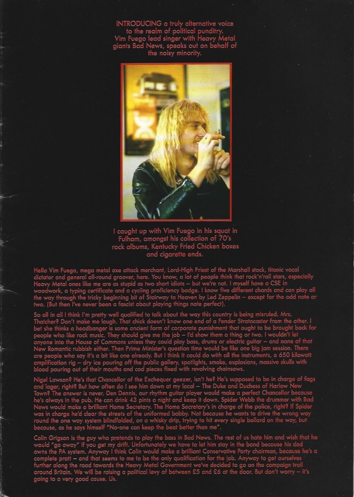 Thanks to Nigel Planer for uploading an audio bootleg of Bad News live at the Hammersmith Odeon, 5th November 1987 Bad News are Vim Fuego, vocals and lead guitar (Ade Edmondson); Den Dennis, rhythm guitar (Nigel Planer); Colin Grigson, bass (Rik Mayall); and Spider “Eight-Legs” Webb, drums (Peter Richardson).
