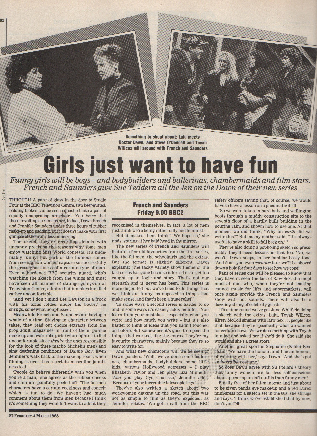 Watching their first series in 1987, I was 12 years old. I simply loved their presence on the TV, and how they weren’t frightened to dress up or be silly. They used a lot of BBC Television Centre in this series too – which I loved! I think it’s episode 5, that’s the one that sticks in my mind the most clearly. Their show is cancelled and they break into Television Centre, they decide to take over the Blue Peter studio and mount the show themselves. They also steal Victoria Woods BAFTA from an awards cabinet at the BBC reception. Rik Mayall makes a small cameo appearence in this episode too – he doesn’t say a word or is even on screen for long, but still makes a visual impact! Dawn and Jennifer were clearly inspired by the environment of Television Centre. Indeed, Jennifer Saunders makes reference to it in her book, Bonkers – My Life in Laughs. For a young girl growing up in the 1980’s, it was really exciting and inspiring for me, to see such an original female comedy double act on TV.
