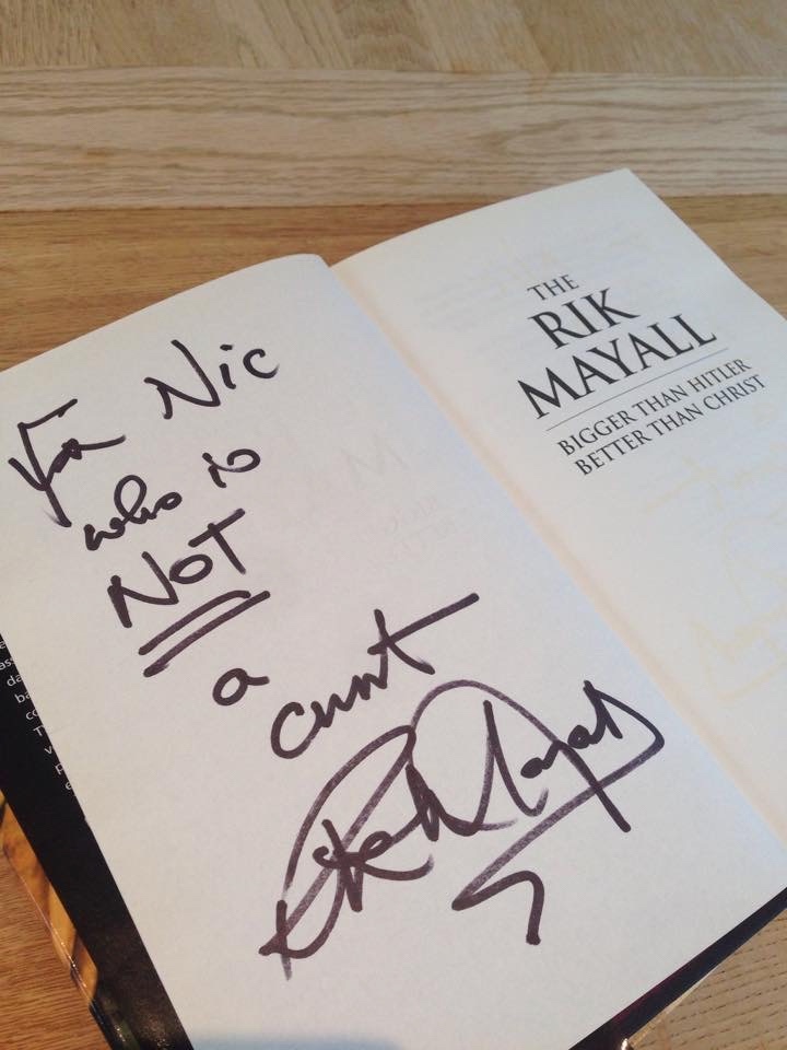 Ian was directing an interview with Rik for BBC’s Football Focus when he recorded Nobel England, and he got him to sign his Bad News album and his brother’s book.