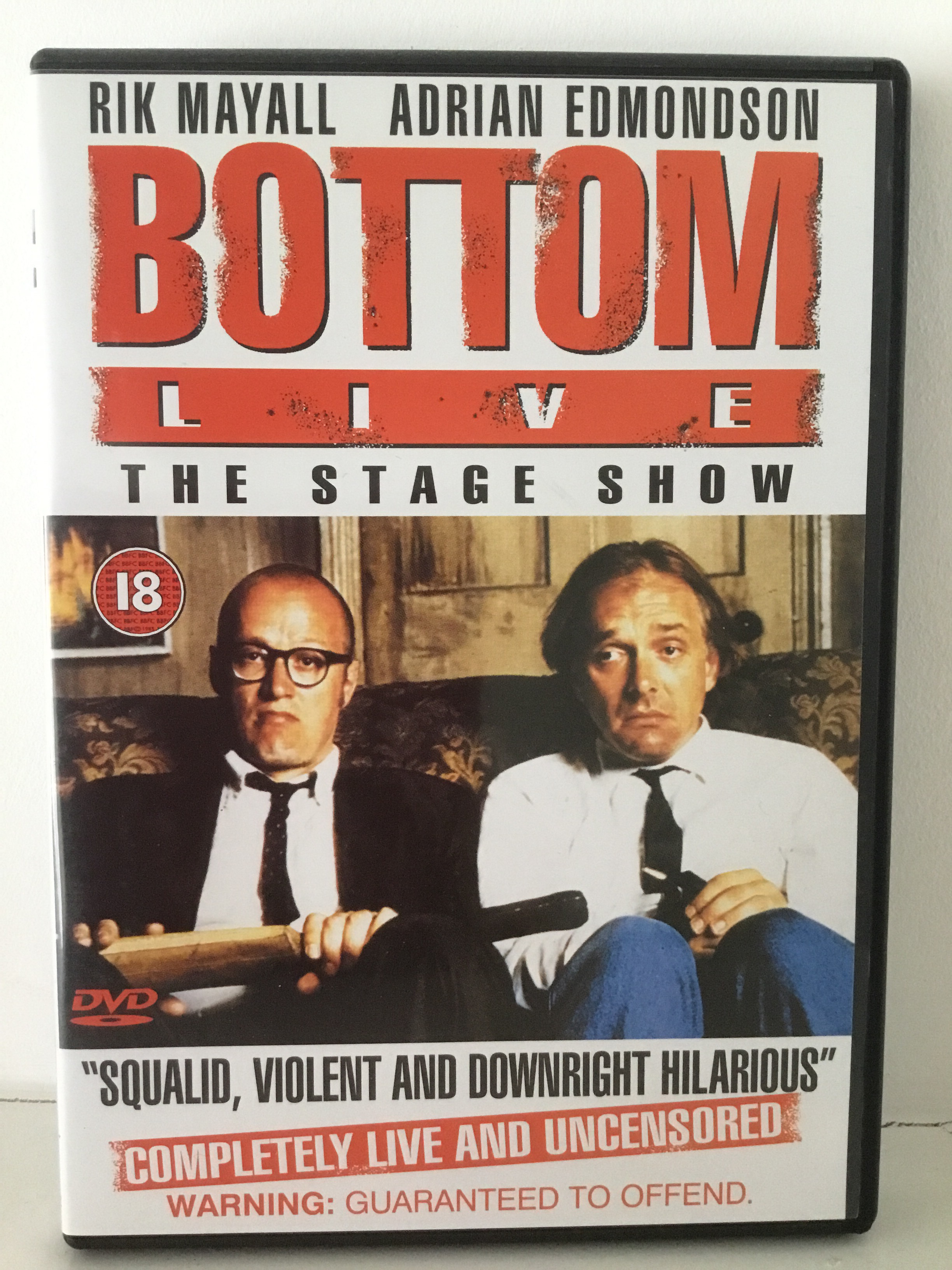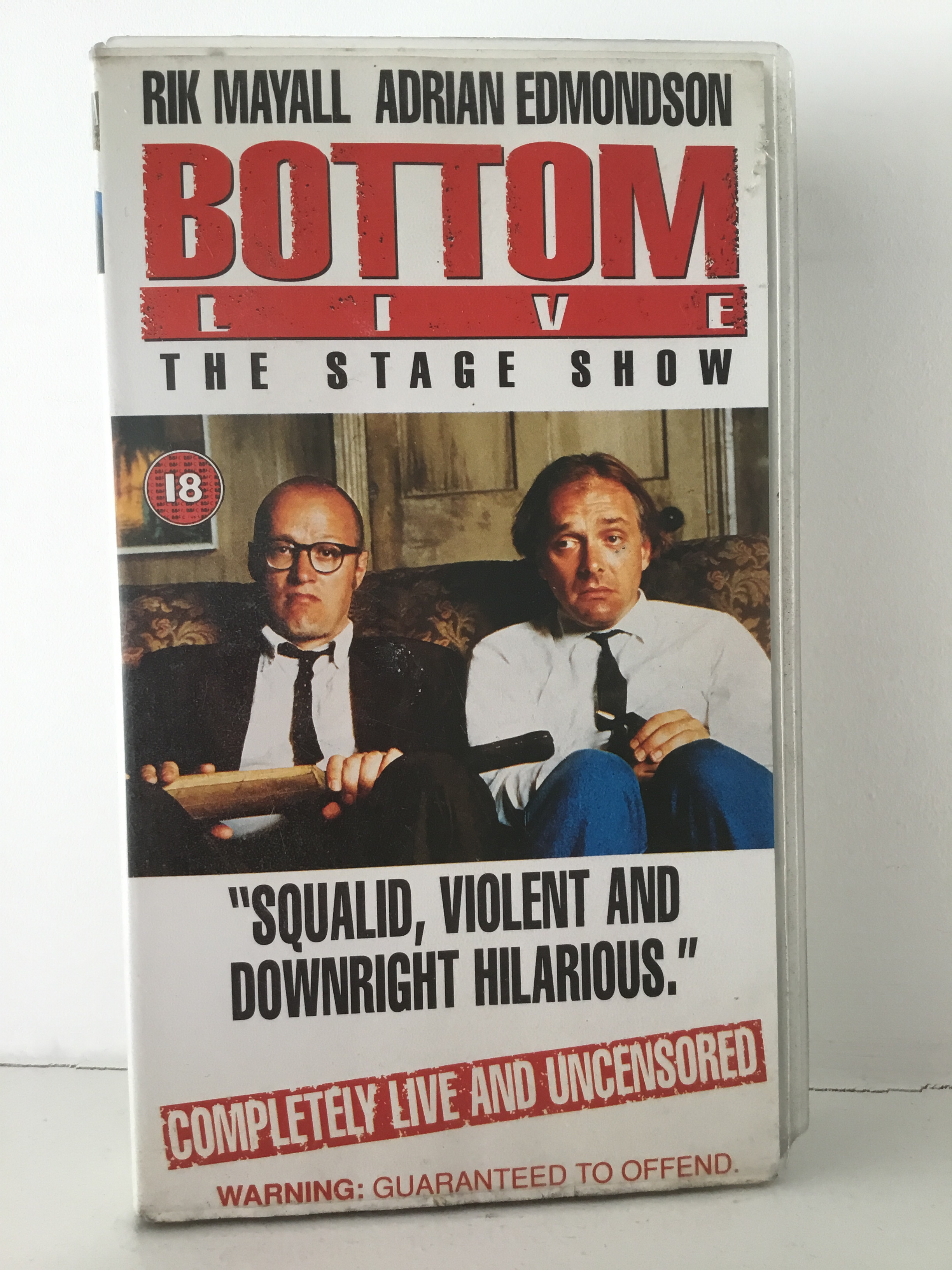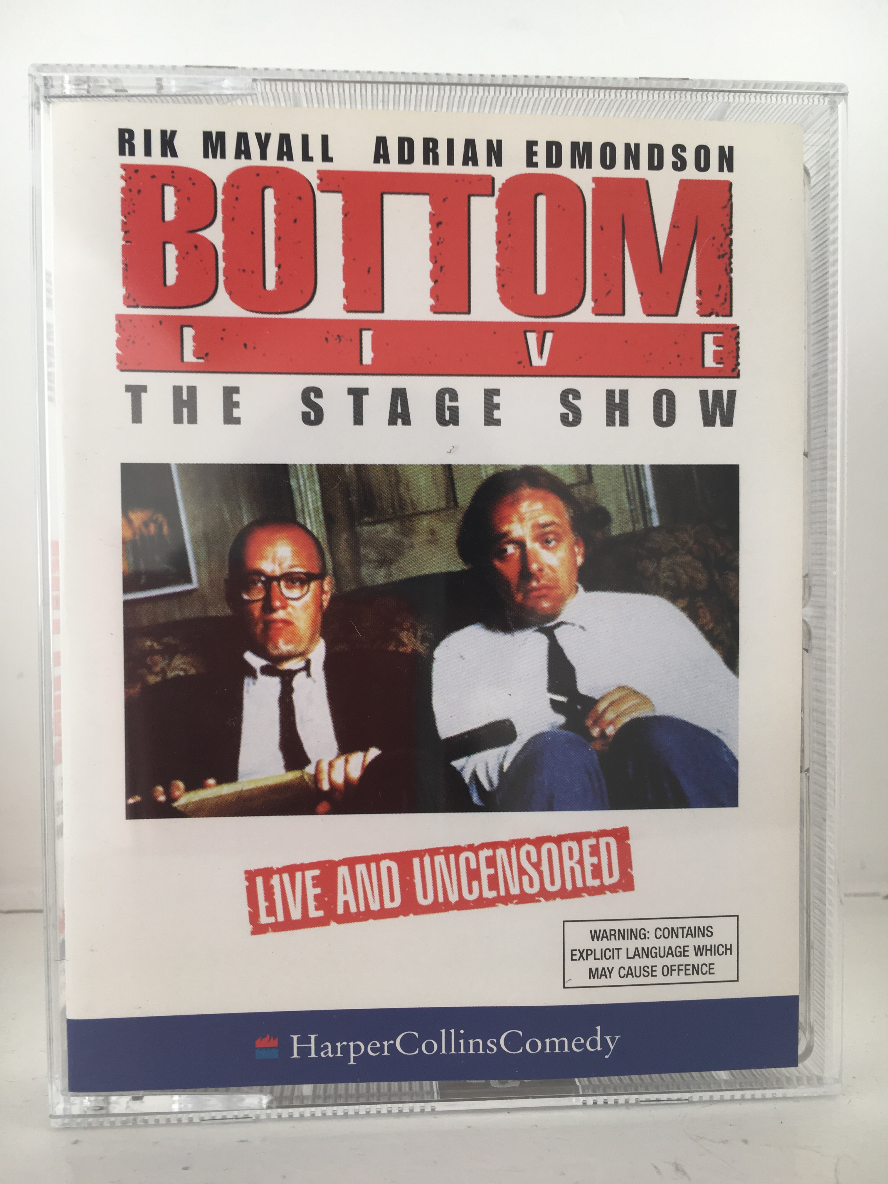 During a period of 10 years Rik Mayall and Ade Edmondson toured the UK with five different productions of Bottom, based on their hit TV Show, performing to thousands of fans at many of the UK’s largest theatres and arena venues. Souvenir merchandise was available and you could buy; the programme, T-Shirts, other clothing and even mugs. Each show was recorded for a VHS release and later to DVD, even audio cassette tapes were available too. I saw the first tour in 1993 at Southampton Mayflower Theatre, which was the venue chosen for the filming. It was filmed over two consecutive nights (18th & 19th June 1993) with the best bits from each show edited for the final video release.